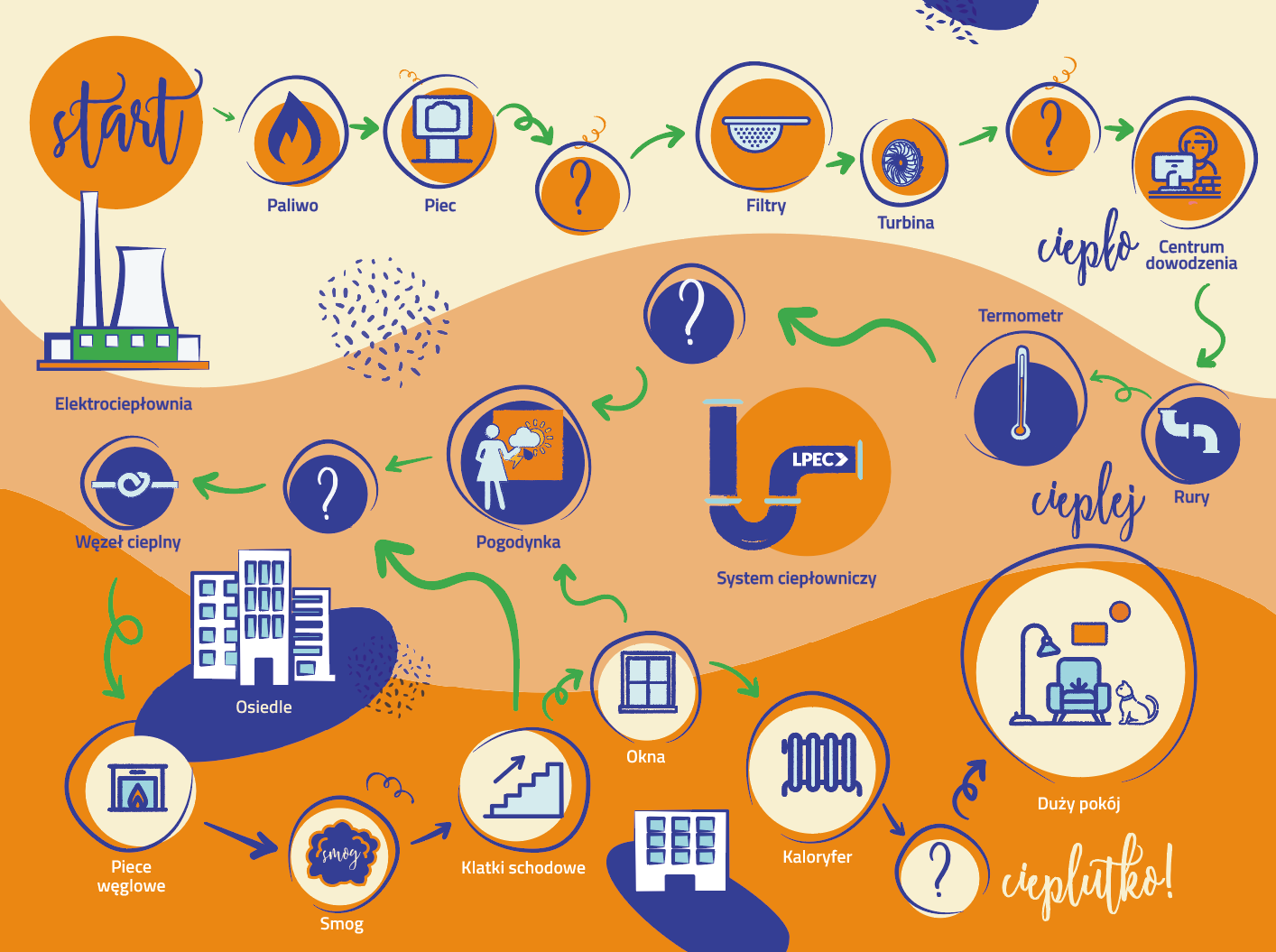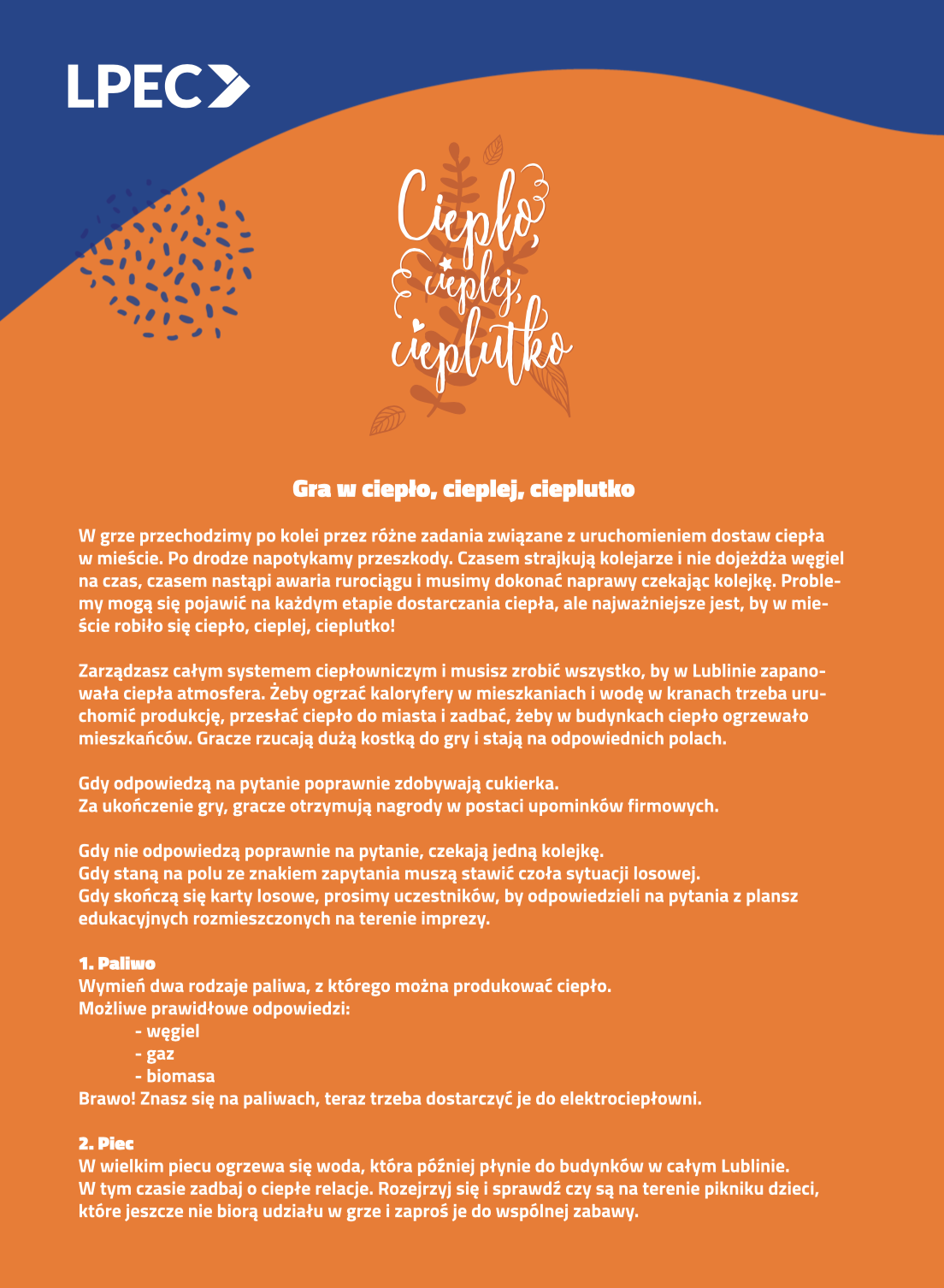 Stoisko edukacyjne Lubelskiego Przedsiębiorstwa Energetyki Cieplnej swoją premierę miało w Dniu Dziecka 2019r. Na nim zobaczyć można grę plenerową dla dzieci „Ciepło, cieplej, cieplutko”. Maluchy wcielają się w zarządcę elektrociepłowni, którego zadaniem jest dostarczyć ciepło do miasta. Po drodze dzieci napotykają przeszkody i niespodzianki losowe (karty ze znakami zapytania), czasem muszą odpowiedzieć na pytania, a przy okazji mogą sporo się nauczyć. Stoisko edukacyjne opracowało Guacamayo.